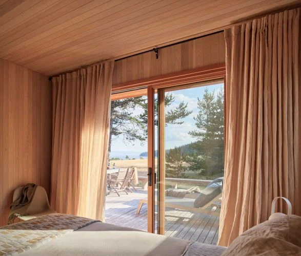 Cedar kaplama dış cephesi ve zamansız rustik-modern tarzı ile mimari sade ama etkileyici. Yükseltilmiş zemini sayesinde sulak alandan korunurken, Shore Pines arasında manzaraya hâkim bir konumda yer alıyor. Meadow, kumlu sahil şeridi ve Salish Denizi'ne bakan geniş pencereler ferahlık ve huzur sunuyor.
